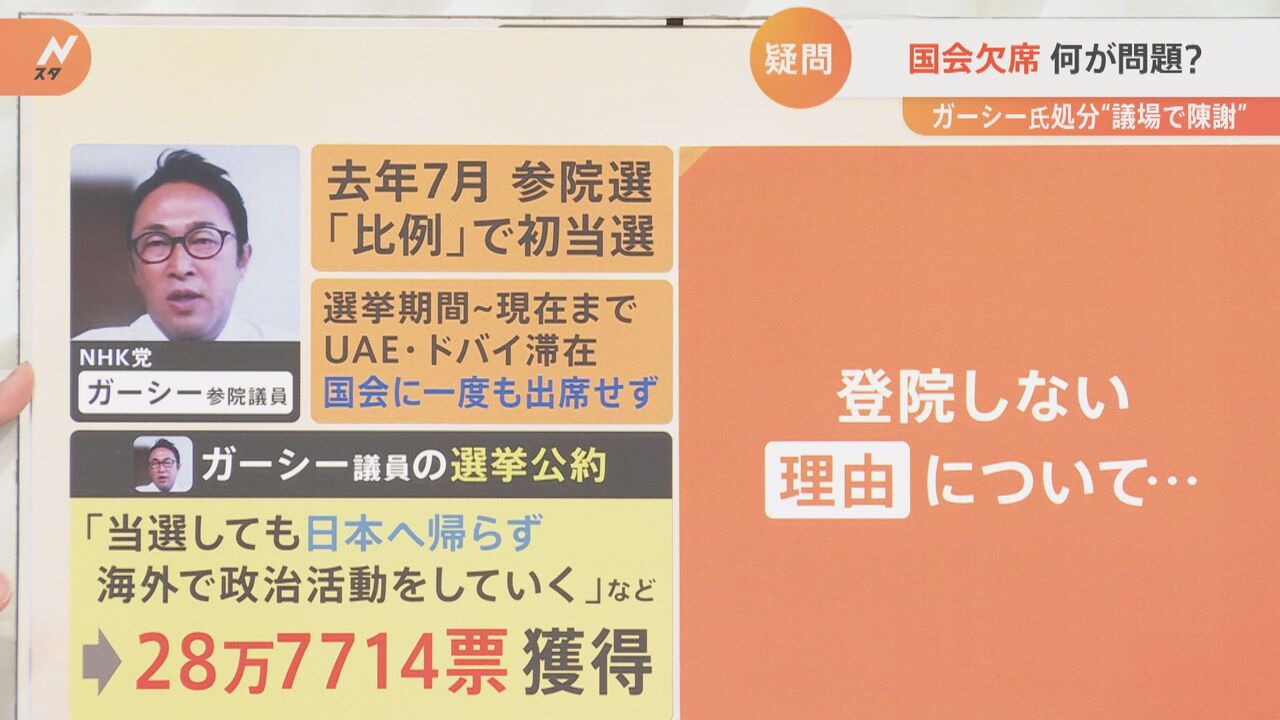 | | 国会欠席で懲罰 歳費4割カット ガーシー議員念頭 法案提出 …国会欠席を続けるNHK党のガーシー議員を念頭に、欠席を理由として懲罰が科せられた議員について、給与にあたる「歳費」を4割カットする法案が参議院に提出された。 (出典:FNNプライムオンライン(フジテレビ系)) |