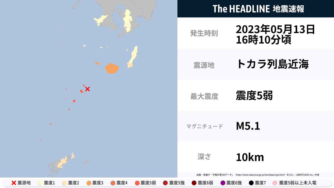 | 鹿児島・十島村で震度5弱観測 トカラ列島近海でマグニチュード推定5.1の地震 …児島県十島村で最大震度5弱を観測する地震がありました。震源は鹿児島県のトカラ列島近海で震源の深さは12キロ、地震の規模を示すマグニチュードは5.1と推定されます。 (出典:TBS NEWS DIG Powered by JNN) |