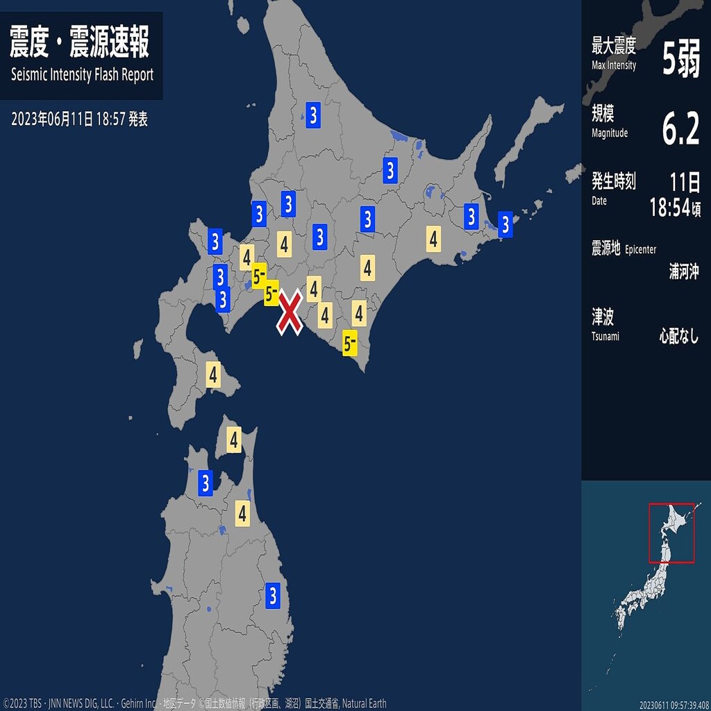 @yamamoto0032<地震情報> 2023年06月11日 18:55頃、北海道で最大震度5弱の地震がありました。 この地震による津波の心配はない様です。 また、この地震は「緊急地震速報」で発表されています。 大きな地震が有った地域では、余震が発生する可能性がありますので、1週間程度は警戒を!! pic.twitter.com/dNtfLvgd6X