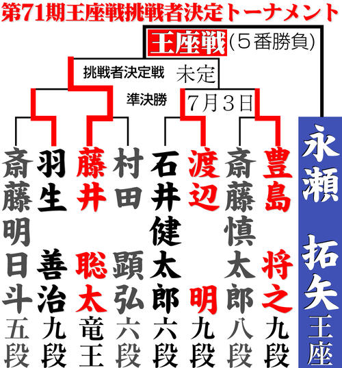 @asahicom藤井聡太名人が八冠へ前進 羽生善治九段に勝ち王座戦挑戦者決定戦へ asahi.com/articles/ASR6X… 藤井聡太名人は準決勝で羽生善治九段を破り、前人未到の八冠独占に向けて前進しました。渡辺明九段と豊島将之九段による準決勝の勝者との大一番を制せば、永瀬拓矢王座への挑戦権を獲得できます。 pic.twitter.com/KFyLeo4ygt
