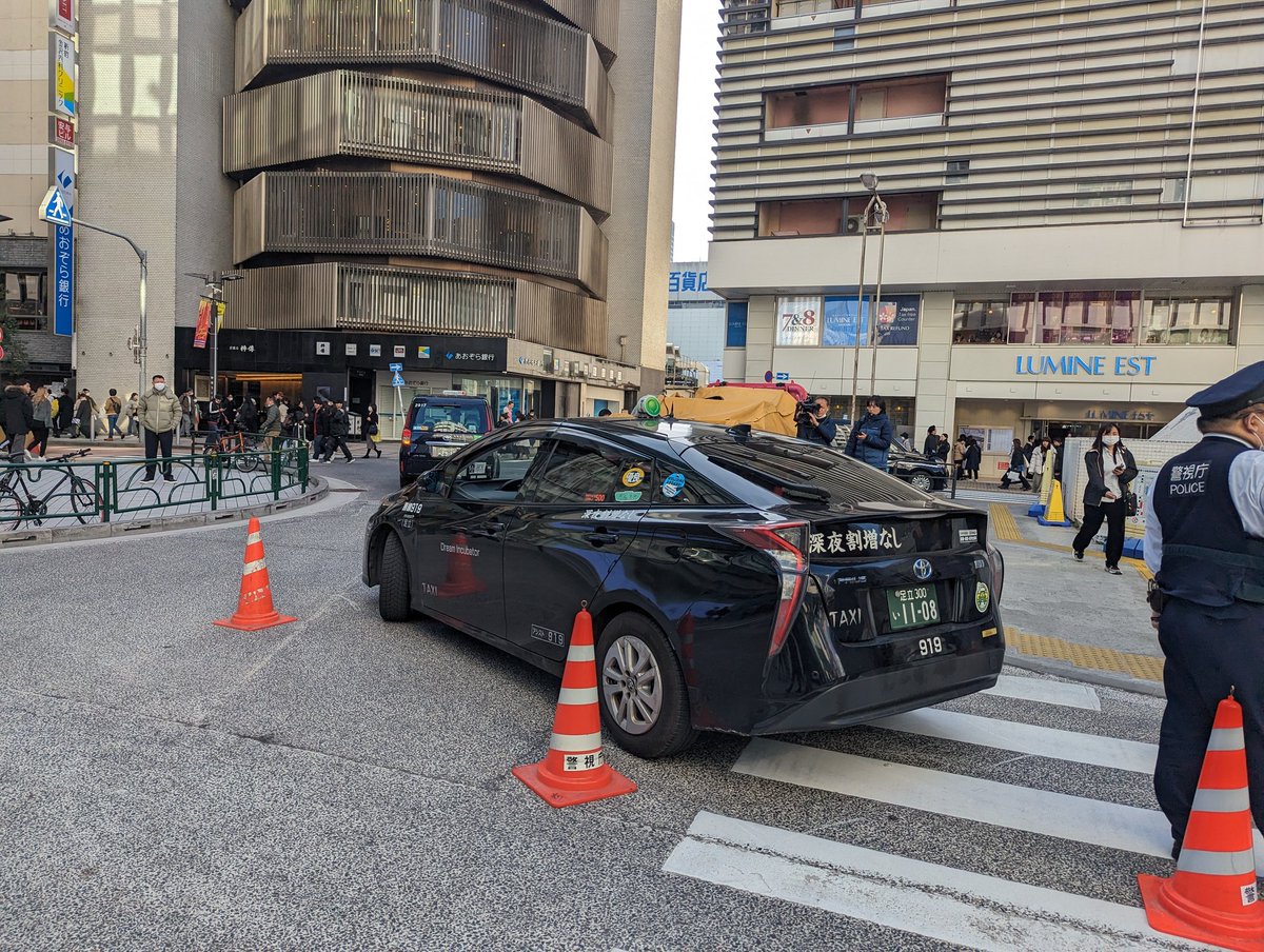 午後、東京・新宿駅前でタクシーと歩行者の事故がありました。男性が一時タクシーの下敷きになり救助されましたが、心肺停止の状態だということです。